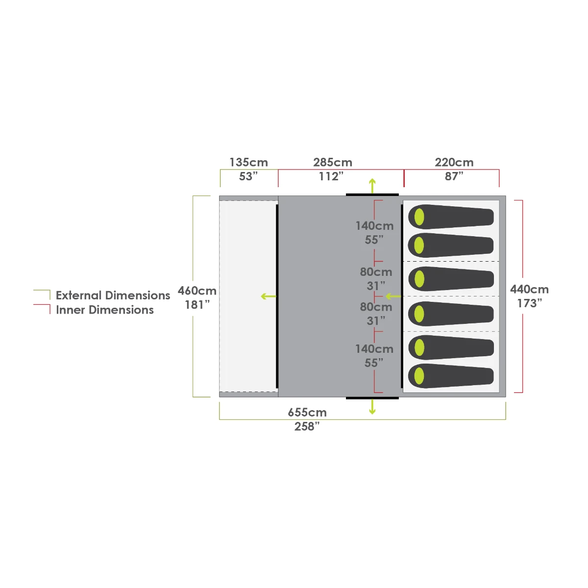 • It is important that lower vents are opened at all times to reduce condensation. During humid or damp conditions, it is recommended that the waterproof door covers are opened to expose the mesh layer, enabling additional airflow throughout your tent.
