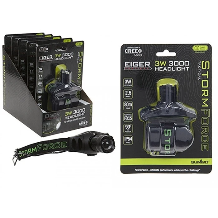 The Summit Eiger Tactical 3W 3000 is an adaptable headlight is practically designed with a 90 degree light movement and an adjustable elasticated head strap.